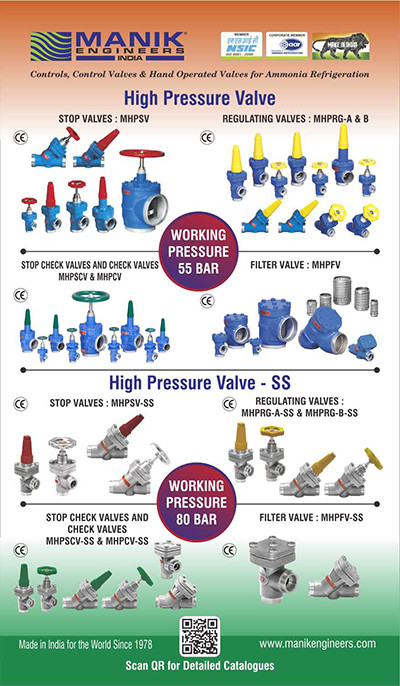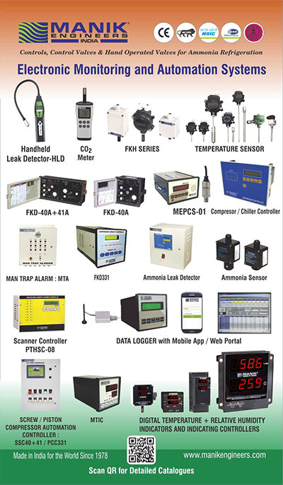 Manik Engineers manufactures controls, control valves for automation of refrigeration plant since 1978, and is truly following the dream of Honorable Prime-Minister Narendra Modi, Make in India. We are “Made in India” since 1978. Our products include Ammonia solenoid valves, Liquid level controllers, Pressure / Temperature Regulating Valves, Stop Valves, In Line Check (Non Return) Valves, Safety Valves, Hot Gas Defrosting system for gravity and pump recirculation plants, Screw & Piston Compressor Capacity Controllers, sensors, transmitters, indicators and controllers fortemperature, pressure, relative humidity, carbon dioxide & ethylene.